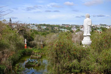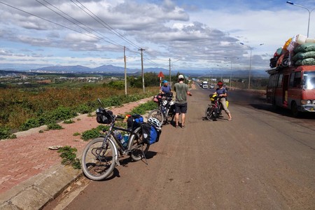 Auch der nächste Tag war wieder von viel Auf- und Abfahren geprägt, allerdings mit weniger interessanter Landschaft. Wir kamen abends in Pleiku an, die letzte größere Stadt vor der Grenze zu Kambodscha. Hier in dieser untouristischen Stadt merkten wir noch einmal, wie wohl wir uns in Vietnam fühlten. Wir konnten selbst hier noch neue kulinarische Entdeckungen machen und verbrachten einen netten Abend mit Curry-Suppe (pho bo kho) und Sapodilla-Shakes auf kleinen Plastikstühlen mitten auf dem Gehweg statt unseres abendlichen Bieres. Unser letzter Tag in Vietnam war ein leichter. Wir hatten keine Infos darüber finden können, inwieweit es Hotels unmittelbar vor und nach der Grenze gibt. Wir wählten daher die sichere Variante und nahmen uns Chu Ty als Tagesendziel vor, wo es Unterkünfte geben sollte – 60 km auf flacher Strecke. Für alle, die die gleiche Strecke beabsichtigen zu fahren: Es gibt ein Hotel sowohl auf der vietnamesischen als auch kamodschanischen Seite direkt an der Grenze. Unser entspannter letzter Tag in Vietnam war ein Genuss nach den härteren Tagen zuvor. Wir begannen den Tag mit der Besichtigung eines Tempels in Pleiku, was eine sehr schöne Erfahrung war. Die Anlage strahlte eine angenehme Ruhe aus und es waren nur wenige vietnamesische Touristen dort. Nach einem Kaffee nahmen wir die Kilometer in Angriff. Trotz des wenig anstrengenden Tages, gönnten wir uns wie immer ein leckeres Abendessen und wurden von den Nachbartischen abwechselnd zu vietnamesischem Vodka (Reisschnaps) eingeladen. Thorsten stand an diesem Abend auf 8 Beinen ;)