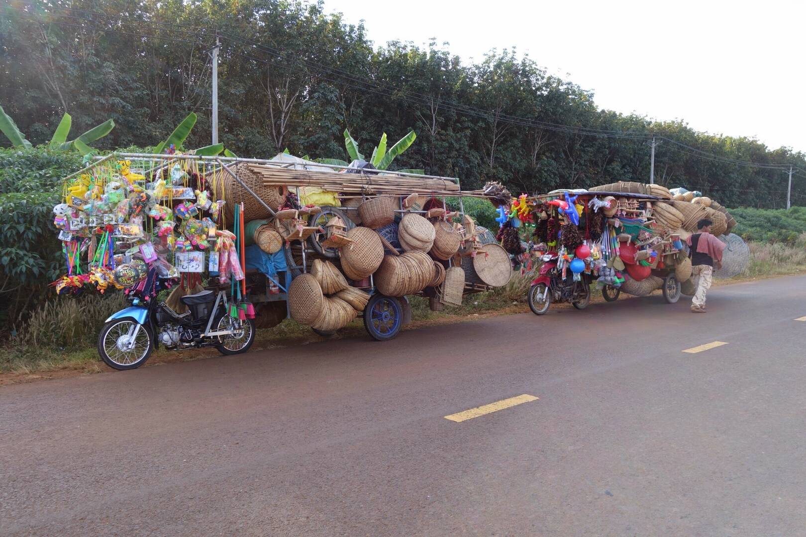 Der Grenzübertritt nach Vietnam war ein wenig amüsant und erforderte Beharrlichkeit und Verhandlungsgeschick. Sowohl die laotischen als auch die vietnamesischen Beamten verlangten von uns für den Ausreise- bzw. Einreisestempel eine “Gebühr” von 1$ pro Stempel. Wir blieben stur und demonstrierten, dass wir weder Dollar noch anderes Bargeld dabei hatten, da wir unsere letzten laotischen Kip in Proviant investiert haben. Unsere einzige “Währung” namens Keks wollten sie allerdings nicht akzeptieren und so konnten wir nach wiederholtem Fragen nach der “Gebührenordnung” ohne Bestechungsgelder über die Grenze. Vietnam begrüßte uns schwungvoll mit einer perfekten Abfahrt über 15 km. Wir fuhren durch kleine Dörfer, in denen uns die Frauen mit runden, spitzen Reishüten auf dem Kopf und einem breiten Grinsen grüßten. Verwundert sahen wir, dass die Leute in den Dörfern komische, große Gebilde mit einer kleinen Höhle in der Mitte aus Planen und Plastiksäcken, die silbern angesprüht waren, aufbauten. Wir hielten an und fanden in einem “Gespräch” mit einigen Vietnamesen heraus, dass es sich um eine christliche Krippe handelte. Kurze Zeit später radelten wir durch ein anderes Dorf, in dem wir Frauen am Straßenrand sahen, die Waffeln mit einer gelben Paste aus Ingwer und Erdnüssen bestrichen. Das mussten wir natürlich probieren und das Cu Do, welches eine lokale Süßigkeit ist, entpuppte sich als der perfekte Proviant fürs Radfahren.