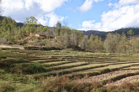 Die ersten Kilometer auf den Fahrrädern nach einer Woche Faulenzen führten uns einen halben Tag lang durch die Stadt und die Ausläufer Chengdus. Wir waren erstaunt wie viel an den Rändern der Stadt noch neu gebaut wird. Wir fuhren eine neu gebaute Straße entlang mit Bushaltestellen, Fußgängerüberwegen – nur nichts war drum herum! Die Planungen scheinen also noch weiter zu gehen. Nach den kleinen Städten Zentralasiens war dieser Bauwahn ein regelrechter Kulturschock für uns. Doch wir genossen diesen Bauwahn auch ein wenig, denn er brachte uns überall neue Straßen mit breiten Seitenstreifen oder sogar innerhalb der Städte Fahrradwege, die allerdings vorrangig von Elektrorollern genutzt werden. Die ersten 180 km bis Leshan waren glücklicherweise schnell geschafft, denn wir radelten durch besiedelte, flache Landschaften mit viel Verkehr. Jeder freie Quadratmeter schien für die Landwirtschaft genutzt zu werden. Da wo leichte Steigungen waren, wurden die Felder durch das Anlegen von Terrassen leichter zugänglich gemacht. Anders als in Europa entstanden dadurch viele kleine Parzellen, die nur mit der Hand bewirtschaftet werden können.